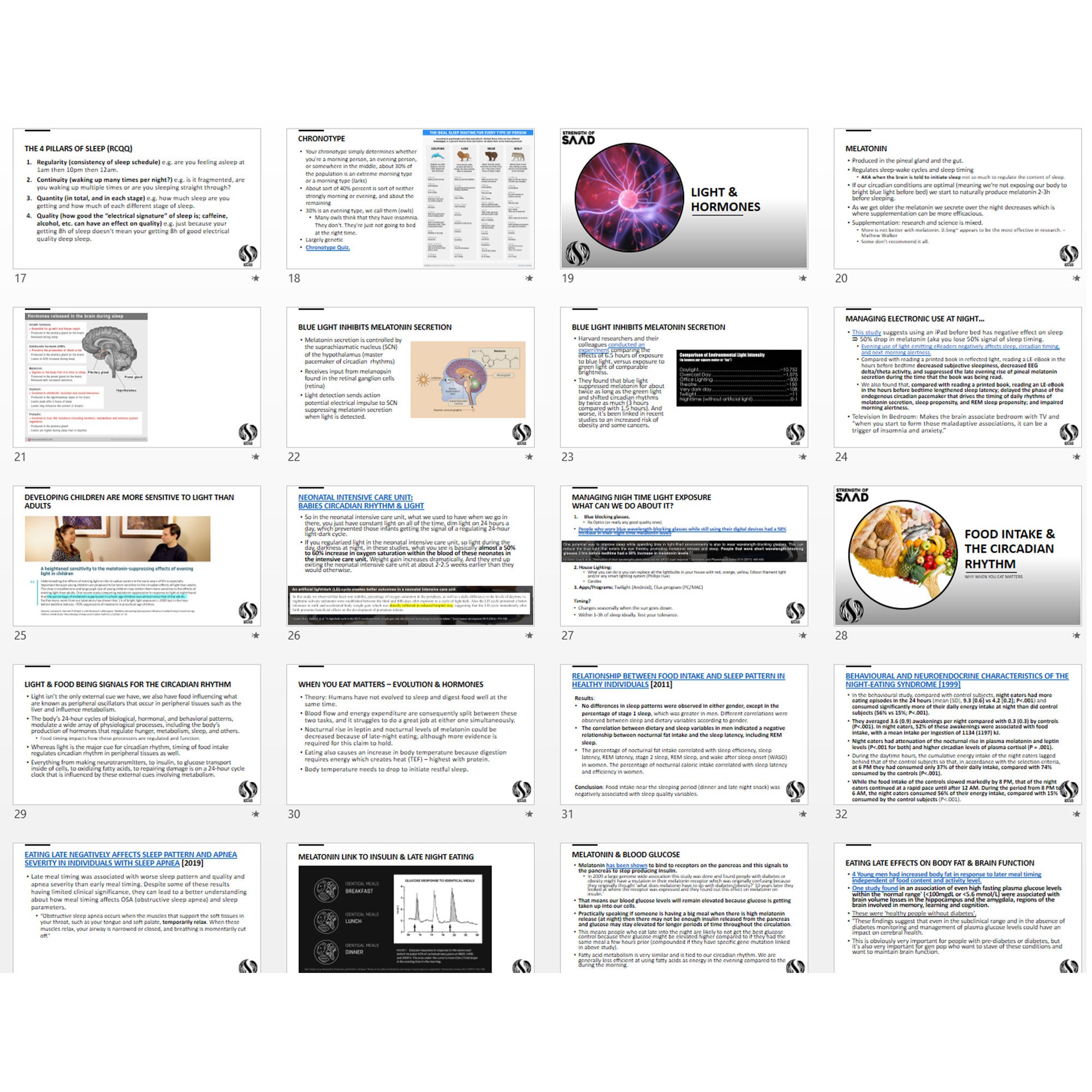 This guide covers 83 pages of the following major categories of sleep. Think, the ultimate Matthew Walker-like sleep science presentation that you can refer to as a resource to improve the sleep of you or your clients.